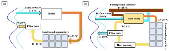 Schematic diagram of land-based aquaculture systems utilizing underground seawater. (a) A traditional system with surface seawater heating; (b) an enhanced system with a heat pump and heat recovery for energy savings and reduced emissions.