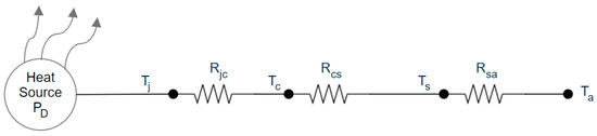 Managing the thermal performance of power electronic devices in EV chargers is crucial for their reliability and efficient operation. Like electricity, heat flows from a region of higher to lower (thermal) potential until a thermal equilibrium is reached [6]. Heatsinks are essential in dissipating the heat generated during charging, ensuring safe operating temperatures, and preventing electronic component failures. As shown in Figure 1, heat flow through the thermal resistances of the electronic components depends on the temperature delta between the junction (Tj) and ambient (Ta) temperatures. TC and Ts represent the components’ case and heatsink temperatures. Power (PD) is dissipated as heat from the component’s junction to the operating environment. Therefore, the aggregate thermal resistance of a heatsink is a measure of its heat transfer efficiency, and it is dependent on the thermal resistances of the junction-case (Rjc), case–sink (Rcs), and sink-ambient (Rsa) values specified on the component datasheets.