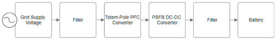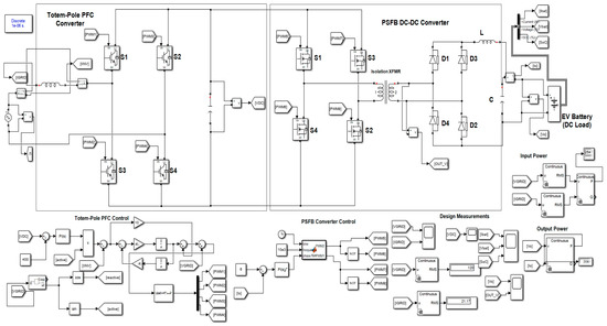 Figure 3 shows the charger’s MATLAB/Simulink model. It consists of the grid supply (120 V, 60 Hz AC), an input filter for harmonic reduction or noise attenuation to and from the mains, and a totem-pole power factor correction (PFC) AC/DC rectifier circuit, which converts the AC mains power into a sinusoidal half-wave pulsating DC voltage of 400 V and offers over 90% PF. The totem pole topology was selected because of its low current ripple, high efficiency, low component count, and ability to operate in bi-directional mode if required. The rectified phase-shifted full bridge (PSFB) DC-DC converter has an output of 43.5 VDC at a switching frequency (Fsw) of 10 kHz. The PSFB converter is designed to achieve a 20% current ripple and a DC ripple voltage of 1% and to operate at a 50% complementary duty cycle. It steps down the 400 Vdc output from the PFC converter stage to 42 Vdc for the two-wheeler. The DC–DC converter can realize electrical isolation between the power supply stage and the output stage of the charger. The transformer is used for galvanic input and output isolation to protect the battery load from fault currents [25]. It also steps down the output voltage from 400 VDC delivered by the rectifier stage to 42 VDC.