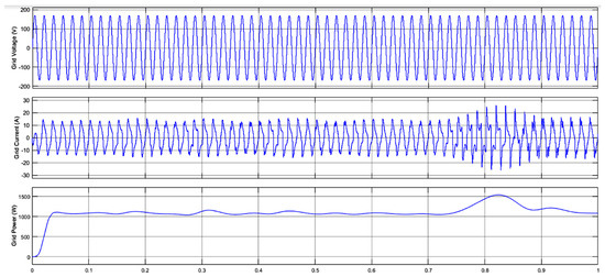 Figure 4 illustrates the input electrical characteristics of the EV charger’s connection to the power grid. The waveforms represent the voltage and current drawn from the grid, indicating a 120 V, 9.54 A, 60 Hz AC supply. Figure 4 also shows that around 1145 W of power is drawn from the grid, which is the charger’s input power. The smooth sinusoidal nature of the waveform reflects the effectiveness of the input filter in minimizing harmonics.