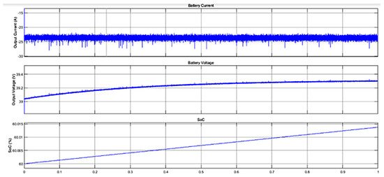 Figure 5 shows the charger’s output electrical characteristics as delivered to the EV charger’s battery pack. The waveform highlights the DC output voltage, showcasing the conversion efficiency and stability of the power rectification and DC–DC conversion stages. Features like a low ripple voltage of 0.42 V and stable DC output voltage of 42 V emphasize the charger’s capacity to deliver consistent power to the battery, reducing wear and improving charging efficiency. As shown in Table 1, the charger’s output power of 1042 W implies that up to a 91% charging efficiency was achieved. This high efficiency shows that this charger design utilizes most of the energy from the grid effectively to charge the battery with minimal losses. Furthermore, the SoC waveform indicates a gradual and linear increase in the battery’s charge state over time, suggesting a stable charging process with minimal stress on the battery to promote extended battery life. This result validates the fact that the electronic components that make up the charger were carefully selected to achieve a robust charger design. This also demonstrates the functional integrity of the simulated charger model.