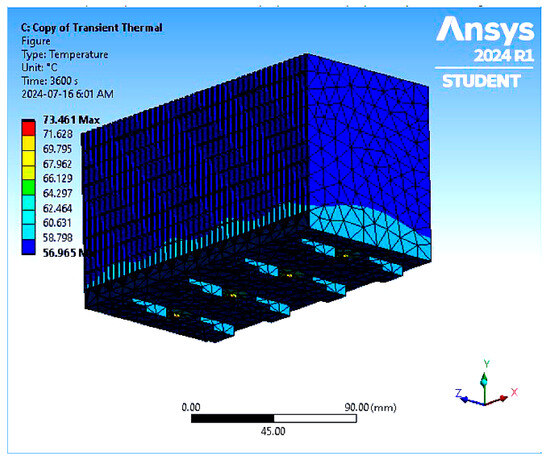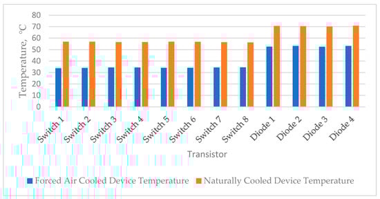 Overall, the maximum temperature of switch S1 improved significantly, by 40.7% from 56.87 °C under the naturally cooled scenario to 33.73 °C under the fan-cooled scenario. Diode D4’s temperature declined by 24.9%, from 70.84 °C to 53.171 °C.