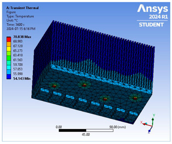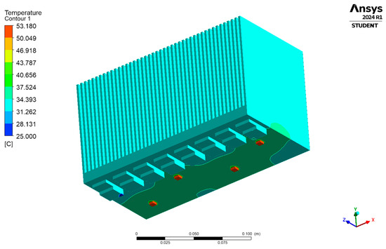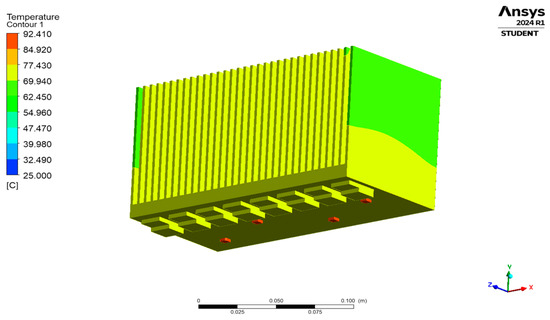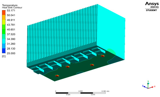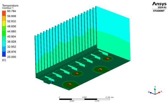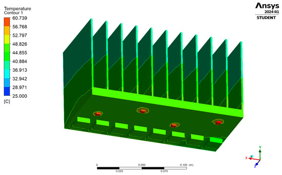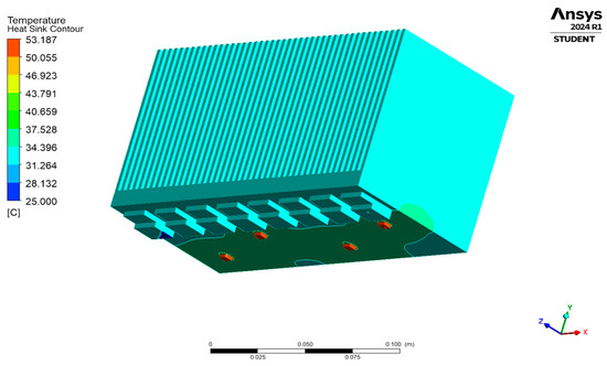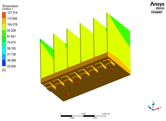In model P2-B, shown in Figure 11, the transistor devices were rearranged, with D1–D4 grouped on the left side of the fin base, while S1–S8 were grouped on the right side. In this case, S4 yielded the maximum switch temperature of 58.3 °C, an 11.5% decrease from the original model’s performance. However, D4 recorded the maximum diode temperature of 82.76 °C, a 12.3% decline in performance. The likely cause of this decline in performance is that the heat flux was now disproportionately concentrated at one end of the sink base.