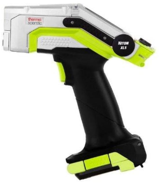 The analysis of the elements was carried out using an X-ray spectrophotometer with an SDD detector in the GOLDD XRF Niton XL5 technology from Thermo Scientific (Waltham, MA, USA) (Figure 1). The XRF analyzer works on the principle of measuring fluorescent (or secondary) X-ray radiation emitted by a sample excited by a primary X-ray source. Each of the elements present in the sample produces a set of characteristic fluorescent X-ray rays, unique to each of the elements. The emitted rays are captured by the detector; then, the obtained spectra are processed by a processor, and the final result is the qualitative and quantitative composition of the sample [].