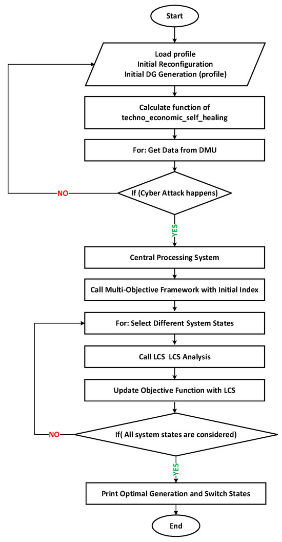 Furthermore, previous research efforts have contributed significantly to understanding and addressing challenges in microgrid management. For instance, research [22] assesses the reliability of distribution systems and the influence of non-utility-owned distributed energy resources (DERs), employing strategies such as transactive reactive power management to enhance voltage profiles and restore additional loads during outages. F. Guo et al. [23] proposed a control strategy to improve transient and steady-state performance, supported by extensive theoretical analyses and experimental verification, highlighting its potential for enhancing voltage recovery and power sharing in DC microgrid clusters. In another study, Ref. [24] focuses on enhancing cyber-resilience through demand response strategies using deep reinforcement learning (DRL), and it primarily targets load-side flexibility without addressing dynamic network-level reconfiguration. Additionally, the iterative training and inference processes in DRL introduce significant computational overhead, which can limit real-time applicability in large-scale systems. In contrast, the proposed framework leverages the large change sensitivity (LCS) method to achieve real-time self-healing and system optimization. By employing a recursive approach, the LCS method immediately updates the power flow states under cyber–physical disturbances without recalculating entire power flow equations, ensuring rapid adaptability with minimal computational burden. Our framework further incorporates a comprehensive multi-objective optimization strategy that addresses technical, economic, and reliability metrics, including power loss minimization, voltage profile improvement, and resilience to cascading failures. Additionally, [25] presents a method for establishing dynamic MGs aimed at restoring power distribution systems, focusing on enhancing computational efficiency using adaptive models. Tested on IEEE feeders, the method illustrates decreased complexity and reduced average total load shed, underscoring its effectiveness in managing mobile energy resources. Moreover, [26] introduces an adaptive power management strategy tailored for MGs with renewable energy integration, mitigating power fluctuations and enhancing system stability. The study [27] evaluates the operational reliability of urban multi-energy systems, showcasing the potential of equivalent energy storage to enhance system reliability. Additionally, [28] focuses on enhancing power system resilience through adaptive decision-making strategies, while [29] proposes decentralized energy management techniques to optimize microgrid performance. Finally, [30] explores cyber–physical security in distribution networks, emphasizing the need for robust monitoring and collaborative cybersecurity measures to address emerging threats. Similarly, [31] delves into anomaly detection in cyber–physical systems, highlighting the importance of early detection and advanced machine learning techniques. Furthermore, an extensive examination of techniques aimed at maximizing the efficiency of DERs and strategies for controlling MGs is provided, highlighting the importance of advancing research in areas such as risk mitigation in dispatch models, managing batteries, developing pricing strategies for urban centers, and implementing multi-agent-based controls. Additionally, a novel framework integrating blockchain for secure data transactions, PEM optimization for scheduling, and the CCS algorithm for optimal operation in interconnected microgrid scheduling is proposed [32].