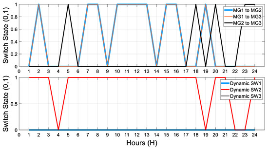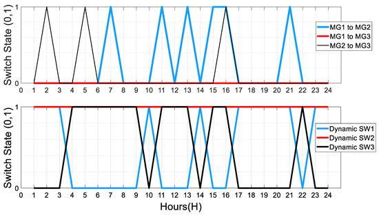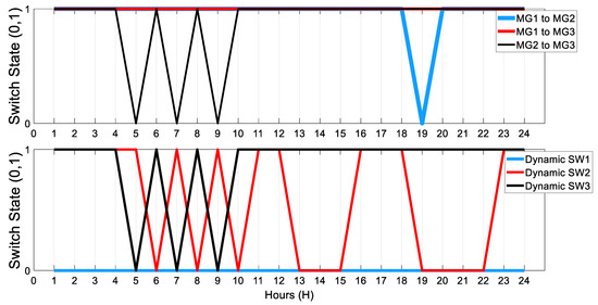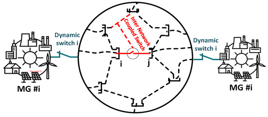 As depicted in Figure 3, power distribution lines interconnect the different components of a distribution network with MGs. Controlling the opening and closing of circuit breakers within the network achieves the dynamic reconfiguration of both the distribution network and its linked MGs. Consequently, the MGs can operate optimally and safely in two modes: (1) when they are connected to the main network and (2) when they are isolated from the main network (operating in islanded mode), where energy exchange occurs between the microgrid and the main network during the connected mode. Furthermore, other coupling switches within the network can alter the power distribution path by opening and closing actions. Equation (16) describes the use of a binary formulation to represent the open or closed states of switches in the network, where 0 displays the open state and 1 demonstrates the closed state.