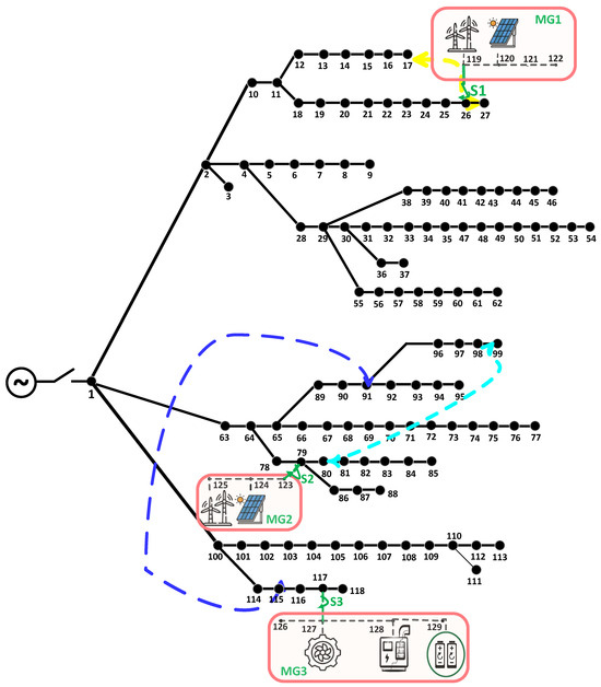 The importance of cybersecurity in cyber–physical MGs has gained prominence in smart-grid discussions [15]. Energy management systems (EMS) play a pivotal role in overseeing and regulating power flow within MGs [16], utilizing real-time data to optimize energy resource utilization, manage storage systems, and maintain a balanced connection with the main power grid [17]. Integrating network reconfiguration (NR) components into EMS can improve efficiency, reduce power losses, and yield cost savings, benefiting both utility providers and consumers [18,19]. Dynamic reconfiguration in MGs involves adjusting the grid’s setup during operation to ensure stability and efficiency in the power supply [20,21].