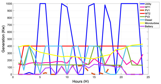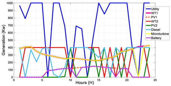 The formulation of cost models for photovoltaics, wind turbines, battery energy storage systems, diesel generators, microturbines, and the grid is expressed through Equations (6)–(11) as detailed in [37,38].