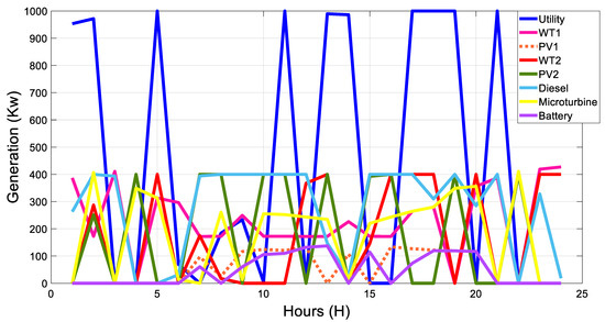 The variables and represent the fixed costs, encompassing factors such as the initial investment, equipment lifespan of the units (), annual interest rate (), and capacity factor (CF), which includes solar panels (PV), wind turbines (WT), and battery energy storage (BESS). Conversely, variable costs involve expenses like fuel for generators and maintenance. Additionally, for generators capable of being turned on and off, such as microturbines (MTs) and diesel generators (DIGEs), costs encompass the environmental impact from emissions like carbon dioxide (CO2), sulfur dioxide (SO2), and nitrogen oxides (NOx). The Generation Cost is influenced by both the actual power and the specific cost coefficients (a, b, c) [32]. A specialized method exists to consolidate the management of these costs into a single objective using a parameter called .This parameter combines concerns about emissions and generation, facilitating decision-making on how to operate the microgrid in a cost-effective and environmentally friendly manner by adjusting it based on the maximum power output of the equipment as expressed in Equation (11).
