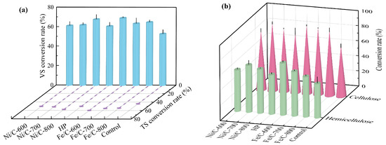 Generally speaking, more cellulose and hemicellulose were converted for Fe/C and Ni/C groups as compared to the HP and control groups. Fe/C and Ni/C groups achieved conversion rates of 78.3–90.1% cellulose and 53.6–69.3% hemicellulose, which were generally higher than those of the HP (78.7% and 52.4%) and control groups (66.6% and 45.5%), respectively. Fe/C-600 obtained the highest conversion rates of cellulose and hemicellulose (90.1% and 69.3%), which were higher than those of the HP and control groups. This indicated that depolymerization with catalysts can significantly enhance the conversion of cellulose and hemicellulose, thereby promoting the increase in biomethane yield, as shown in Figure 2b.