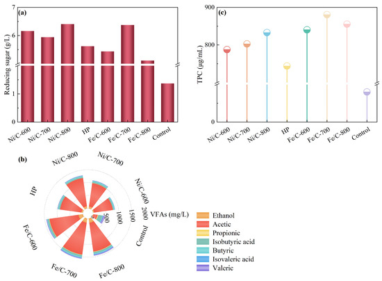 During the DC process, CS was partially decomposed into some intermediates with small molecules and transferred to liquid fractions [13]. It was found that RS, VFAs, and TPC are typical components in the liquid fraction of depolymerized CS (Figure 4). During the DC process, glycosidic bonds in the xylan chains of hemicellulose and cellulose were selectively hydrolyzed, releasing certain amount of RS (mainly oligosaccharides and monosaccharides) that can be rapidly utilized in the AD process [39]. As depicted in Figure 4a, RS concentrations of Ni/C groups were higher than those of HP, which indicated that the catalyst addition could effectively facilitate the hydrolysis capability. RS concentration of Ni/C-800 reached 6.4 g/L, which was 1.1 and 4.7 times more than those of the HP (5.6 g/L) and control groups (1.4 g/L), respectively. As RS is more easily used by AD microorganisms, this is one of the reasons for the higher biomethane production and earlier DBP peaks in the Fe/C and Ni/C groups (Section 3.1.1). This is consistent with the findings of Xu et al. [40] and Li et al. [9].