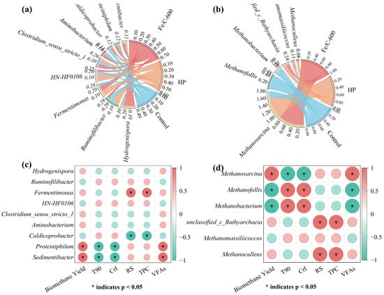 Spearman correlation analysis (Figure 5c,d) indicated that Fermentimonas exhibited a robust positive correlation with RS and TPC (p < 0.05). Additionally, Methanosarcina demonstrated a positive correlation with biomethane yield and VFAs (p < 0.05), while exhibiting a negative correlation with T90 and CrI (p < 0.05). This suggested that DC can significantly improve the accessibility of cellulase in CS and shorten the fermentation time while increasing the biomethane yield. Additionally, Methanofollis and Methanobacterium were found to be negatively correlated with the biomethane yield (p < 0.05), indicating a competitive relationship between these genera.
