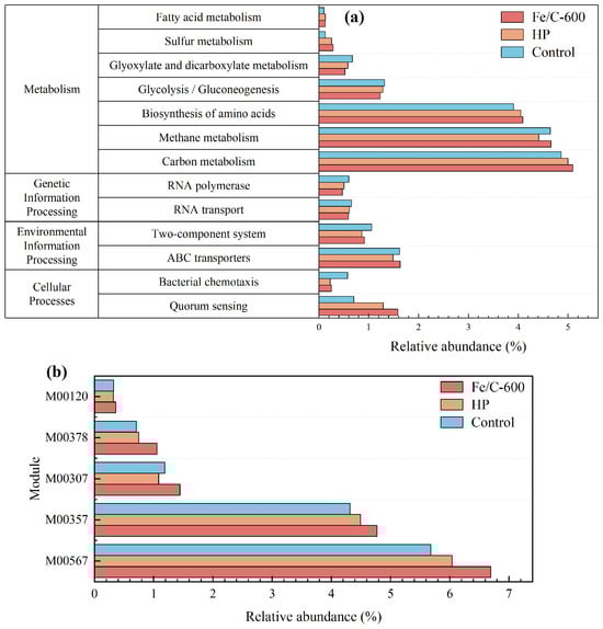 Relative abundance of genes function (KEGG pathway level 3) (a) and main modules (b) related to methanogenesis.