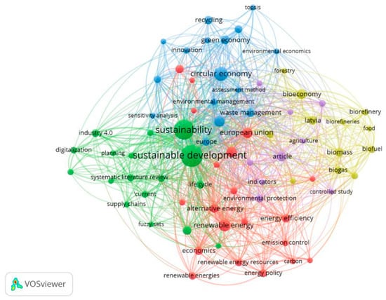 Keywords: “Sustainable development”, “renewable energy”, and “Sustainable development goals”. The figure shows the author’s analysis, via VOSviewer (223 documents were found—period 2018–2024 in the Baltic States).