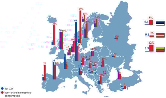 The Baltic States should be viewed as a single energy system; it is planned that in 2050, 98–100% of electricity in the Baltic States will be produced using renewable energy resources, specifically wind and solar energy [48,49,50]. The map in Figure 9 presents details regarding the wind turbines located in the EU, Great Britain, and Norway, along with the proportion of renewable energy in their overall energy usage, with a specific focus on the Baltic States.