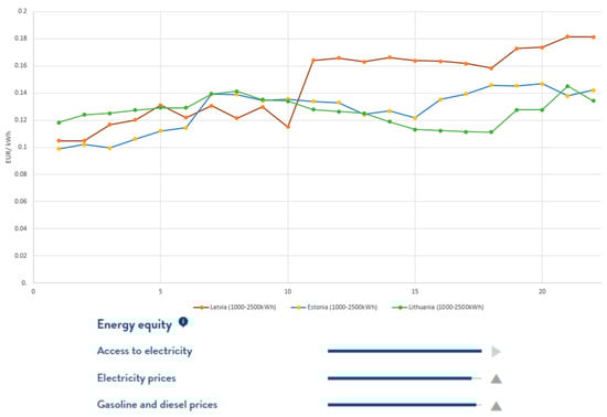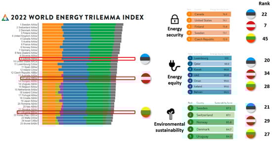 Baltic countries’ performances in the World Energy Trilemma Index, and comparison across sections energy security, energy equity, and environmental sustainability, based on [52].