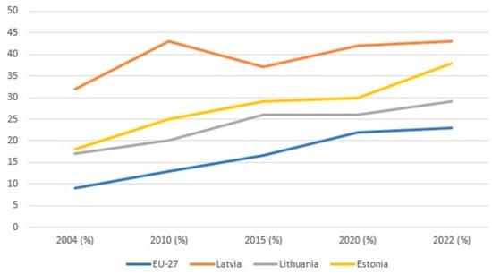 The Baltic States have already demonstrated good efforts to ensure energy independence, including independence from energy imports, energy and carbon intensities, and the contribution of energy products to trade, taking into account their potential impact on the economy. The Baltic States underwent an energy transition in the 1990s following their independence from the Soviet Union in 1991. Due to various economic factors and political shifts, total energy consumption dramatically declined (by nearly 50%) and there was a move towards the use of local renewable resources. Notably, their accession to the European Union in 2004 played a significant role in the sustainable development of their economies and adherence to EU policies [45,53]. Figure 11 illustrates the overall energy share during the recent period, showing the situation of the Baltic States in comparison to the European average.