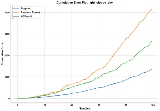 Figure 11 shows a summative error plot of forecast errors for cloudy sky GHI forecast in Prophet, Random Forest, and XGBoost models. The Prophet model (blue line) has the lowest cumulative error across the sample set, providing the best forecasts. As you can see, Random Forest shows the most error growth, which implies less trust in predictions, while XGBoost shows moderate error growth. This plot indicates that the Prophet model outperforms others in reducing GHI prediction errors.