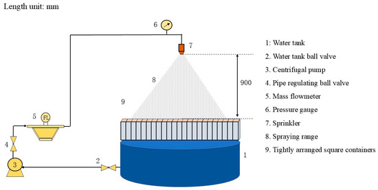 The experimental system included a centrifugal pump, water tank, mass flowmeter, pressure gauge, sprinkler, and a series of closely arranged square cylinders. The centrifugal pump provided the required system pressure. A square cylinder array, uniformly distributed, was positioned 900 mm below the spray. Each cylinder had a capacity of 750 mL (5 × 5 × 30 cm), with a total of 33 cylinders. The schematic of experimental system is shown in Figure 1.