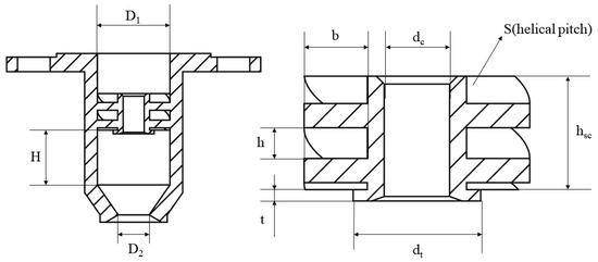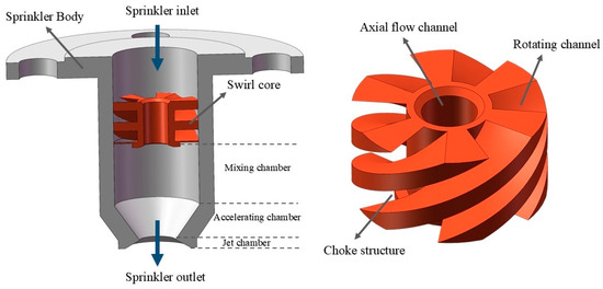 A traditional sprinkler only features a swirl channel, in which the liquid-phase flow is primarily driven by rotary motion. This results in a high tangential velocity at the spray outlet, often creating negative pressure at the center of the sprinkler that draws in air. This phenomenon forms an air core, resulting in a hollow central spray area and poor distribution uniformity [11]. The swirling-straight sprinkler used in this study was an improved version of the traditional pressure-swirl sprinkler, featuring an added axial flow passage at the center of the swirling core to increase the axial velocity of the liquid flow at the outlet. The specific internal structure of the sprinkler divides the liquid flow through the core into axial flow and rotary vortex. These two flows, with distinct motion characteristics, were thoroughly mixed in the mixing chamber. During spraying, the axial and tangential velocities were distributed evenly along the radial direction with a certain gradient, achieving high spray distribution uniformity. The structure of the swirling-straight sprinkler is shown in Figure 2.