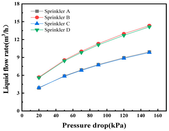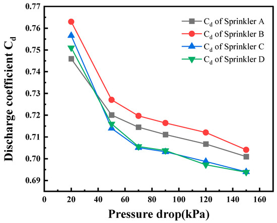 The relationship between fluid flow rate Q and discharge coefficient Cd with pressure drop is depicted in Figure 4 and Figure 5. The flow–pressure drop characteristics revealed that the flow–pressure drop curves for sprinklers A and C, as well as for sprinklers B and D, nearly overlapped. However, at the same flow rate, sprinklers B and D exhibited lower pressure drops compared to A and C, indicating that scaling up the sprinklers effectively reduced the resistance coefficient. Hence, from a structural design standpoint, the impact of altering the through-hole size of the rotary core in the sprinkler on its flow characteristics is significantly less critical, provided that the overall specifications and dimensions remain unchanged. This underscores the fact that scaling up the sprinkler structure to industrial dimensions may reveal issues that are not apparent in the study of smaller-scale sprinklers. Consequently, research into the industrial scale-up of sprinkler structures is of paramount importance.