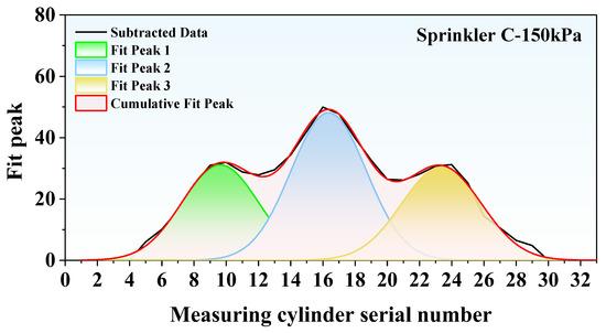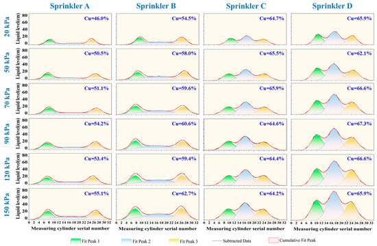Compared to traditional parameters, such as the uniformity coefficient, curve fitting provides a more detailed and convincing representation of the spray volume distribution shape. For instance, under similar uniformity coefficient conditions, the spray volume distribution curve in this study could exhibit either two or three peaks (as shown in Figure 6 for Sprinkler B at 150 kPa and Sprinkler D at 50 kPa), which could not be discerned using a single uniformity parameter.