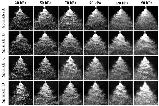 The spray distribution uniformity coefficient was calculated using Christiansen’s 1942 method for liquid volume distribution uniformity, and the radial distribution uniformity was determined from the liquid level data measured using the cylinders [22]. It remains the most commonly used method for calculating spray distribution uniformity. The uniformity of the distribution for the four sprinklers under different pressure-drop conditions is shown in Figure 6, and the corresponding spray-state diagram is shown in Figure 7. The spray distribution uniformity coefficient is calculated using Formula (2).