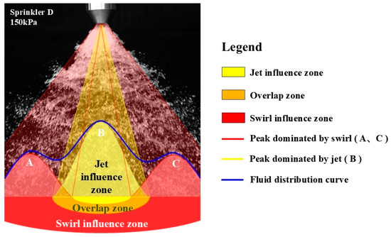 In this study, the primary focus was on the spray liquid quantity distribution curve of the spray equipment, which reflects the vertical apparent liquid velocity distribution. The shape of this curve is closely related to the internal flow dynamics of the spray. Within the spray, the jet and swirl passing through the swirling core were thoroughly mixed in the mixing chamber. At the sprinkler, the axial vertical velocity decreased gradually from the center to the side wall, while the tangential swirl velocity increased gradually from the center to the side wall. A significant reduction in central liquid volume was observed when the traditional swirl sprinkler was scaled up, resulting in a discontinuous distribution curve with two symmetrical peaks. By contrast, the liquid volume distribution curve of an ordinary flat-hole sprinkler exhibited a single peak centered in the middle region. By considering the spray flow field of the coaxial swirl spray as the superposition of the flow fields from an ordinary flat-hole sprinkler and a pressure-swirl sprinkler, the spray liquid quantity distribution curve can be viewed as the superposition of three peaks at any section below the spray sprinkler. As depicted in Figure 8, we divided the flow field of the coaxial swirl spray into jet- and swirl-influence zones, where their interaction formed an overlapping zone.