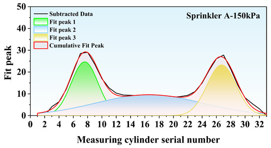 Upon measuring the spray liquid quantity distribution curve, it was observed that under a pressure drop range of 20–150 kPa, sprinklers A and B exhibited a “double-peak pattern”, as shown in Figure 9, while sprinklers C and D showed a “triple peak pattern”, as shown in Figure 10. These liquid volume distribution curves for both patterns could be represented by the superposition of three Gaussian distribution curves, confirming our analysis of the jet–swirl interaction flow field. Therefore, the three Gaussian curves obtained from the fitting corresponded to the jet-influence and swirl-influence regions.