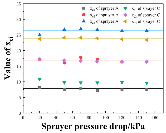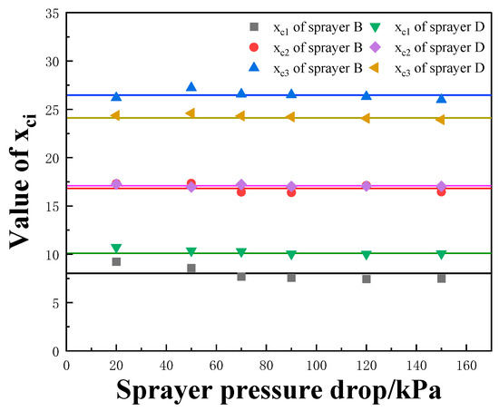 As shown in Figure 11, while the xci values for the three Gaussian functions of sprinklers A and C remained nearly constant across different pressure drops, the small difference between xc3 and xc1 for sprinkler C suggests that increasing the diameter of the through-hole at the center of the core weakened the swirl intensity, thereby reducing the spray angle and spray diameter. As shown in Figure 12, sprinklers B and D also present the same phenomenon.