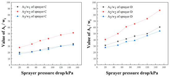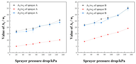 Since the first and third Gaussian peaks for sprinklers A and B, which exhibit two-peak liquid volume distributions, are smaller than the actual experimentally measured values (as shown in Figure 9), while the first and third Gaussian peaks for sprinklers C and D, which exhibit three-peak liquid volume distributions, closely match the experimental values (as shown in Figure 10), it is necessary to differentiate the analysis and comparison of Ai/wi based on the types of liquid volume distributions of the sprinklers.