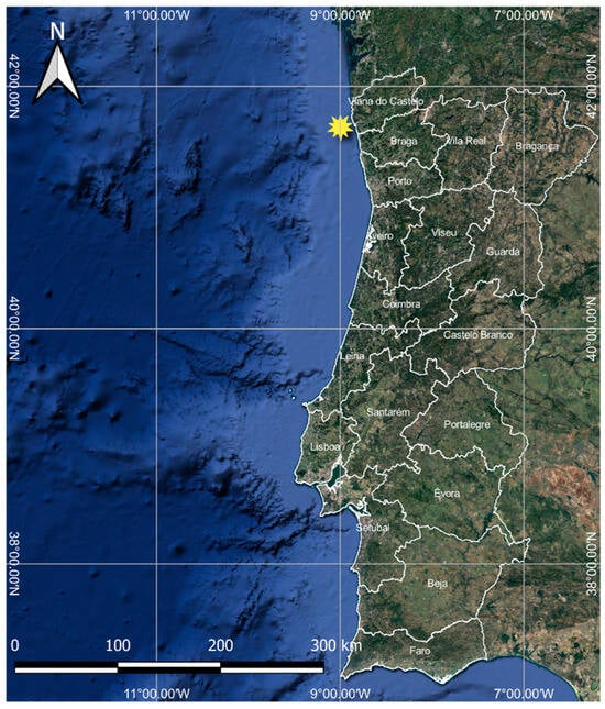 The main goals for this study were to optimise the shape of a heave point-absorber WEC, increase energy absorption, and minimise stresses on the structure. The location chosen as a possible testing location was offshore of Viana do Castelo, in northern Portugal, as represented in Figure 1. This area has been previously chosen as a testing site for other forms of WEC technology testing. The wave characteristics were taken from the Global Ocean Waves Analysis and Forecast data set from the database Copernicus.