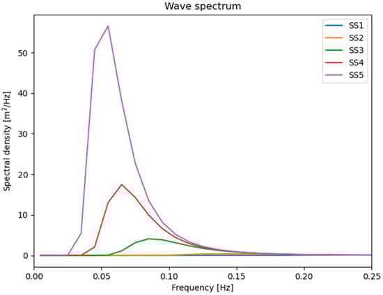 The extreme wave conditions chosen for this study were based on the statistics for Hm0. The 95th percentile and maximum values for this parameter were 3.54 and 5.83 m, respectively, and the value of 4.78 m was chosen as an intermediate between these two, as the 95th percentile value was found for February. The corresponding peak period was 10.82 s for θ, equal to 280.72°. Each sea state described in Table 1 is referenced with a corresponding code—SS—for the sea state and numbering for each sea state. For the average wave conditions, the RMS values for the parameters were used (corresponding to SS3). The wave spectrum for the conditions in Table 1 was calculated using the Pierson–Moskowitz spectrum through the open-source software MHKiT-MATLAB, v0.6.0 [14]. The wave spectra are presented in Figure 2.