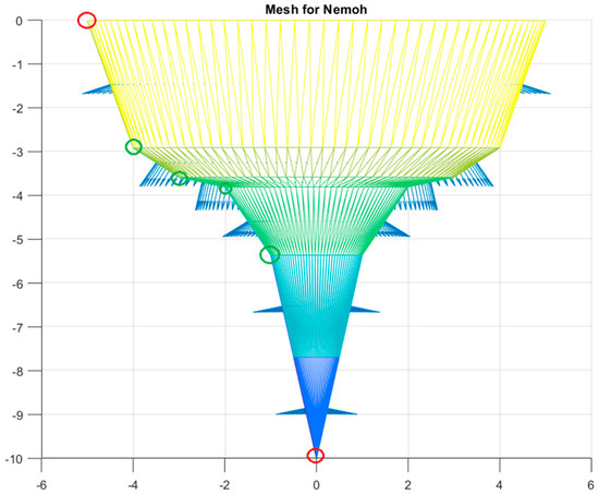 The shape chosen to start the process was similar to a ship’s hull, as a shape that would lead to lower resistance and displacement in the water and a lower impact from viscous effects [19], and the refinement of the mesh was evaluated to assess if it had significant impacts on the results. Using a coarser mesh reduced computational effort and time. The main parameters used to define the mesh in NEMOH included an array of radial coordinates, an array of vertical coordinates, the number of points for discretisation, the number of points for angular discretisation (ntheta) (shown as the red and green circles in Figure 4), and the target for several panels (nfobj) (as seen by the panels in Figure 3). This evaluation focused on ntheta and nfobj. The characteristics of the validation simulations are described in Table 2.