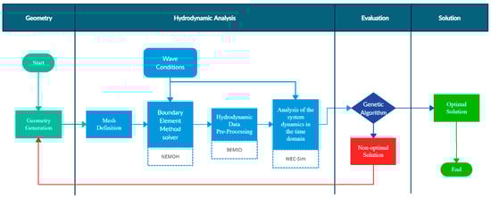 In the above equation, is the body mass matrix, is the acceleration vector of the device, is the wave excitation force/torque vector, is the wave radiation force/torque vector, is the PTO force/torque vector, is the damping force/torque vector, is the Morison element force/torque vector, is the net buoyancy restoring force/torque vector, and is the mooring connection force/torque vector. A synthesis of the workflow is presented in Figure 5.