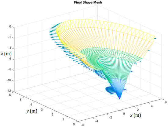 Choosing a more extreme scenario helps determine the maximum energy extraction values while showing how the device performs in a harsher environment. The settings for the algorithm were a maximum of 100 generations and a population size of 10. The maximum of stall generations was also defined and given a value of five. The genetic algorithm stops if there is no improvement in the fitness function results after the number of stall generations. The initial shape’s mesh is represented in Figure 3. The solution which gave the best result of the fitness function was achieved at the 957th iteration, with a shape as described in Figure 6, and the results from this improvement are shown in Table 4.