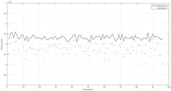 The fitness values are shown in Figure 7. This figure shows the evolution of the fitness values along the number of analysed generations. The curve defines the mean fitness values, and the dots define the best fitness values of each generation.