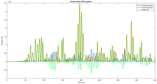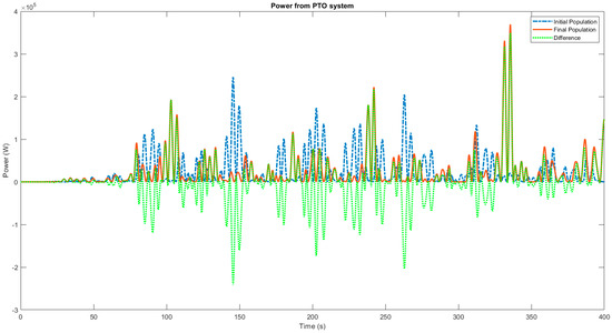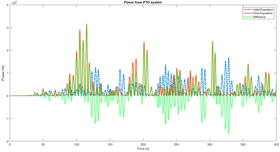 The main comparison between the two shapes was made considering the root mean square of each parameter. There was an increase in the total force in the three DOFs analysed (surge, heave, and pitch) and in the PTO-absorbed power (Figure 8) and energy. The relative difference shown in Figure 7 is calculated similarly to Equation (1), with the following correction: