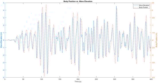 The body’s position is also shown in Figure 9. It is important to note that there are two y-axes in the body position graph, the left corresponding to the wave elevation and the right to the body’s position. While the wave elevation ranges from −5 to 5 m, the body’s position, with the graph at its centre of gravity, only ranges from −4.5 to 0.5 m, about half of the range of the wave elevation.