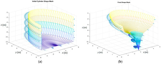 (a) Initial cylinder shape mesh and (b) final shape mesh, both with a draft of 10 m and radius of 5 m.