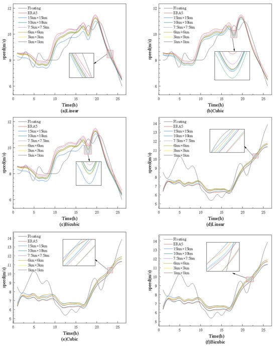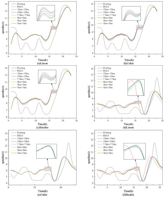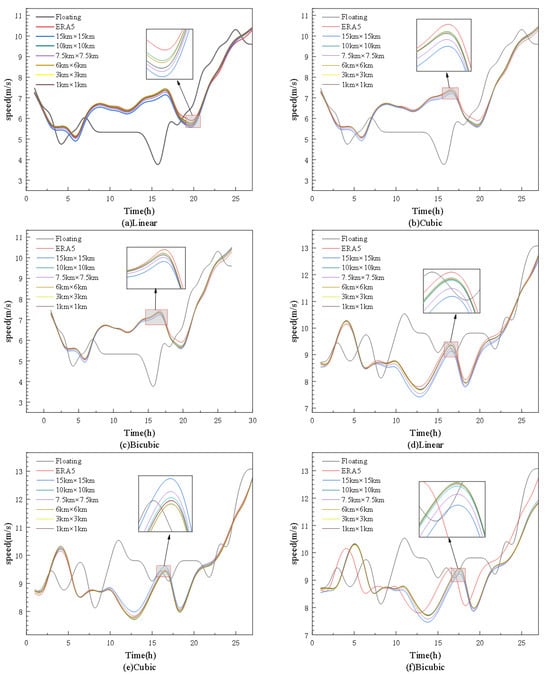 where U(Z) is the wind speed at the height of Z;  is roughness, generally  m on the sea surface; and  is the floating wind height measurement. After extrapolating the floating wind speed to a height of 10 m by using the above formula, the wind speed and correlation coefficient after floating and different interpolation methods and interpolation accuracy processing are compared, and the accuracy of different interpolation methods and accuracy are compared.