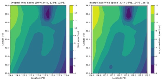 The wind speed data used in this study were sourced from the ERA5 reanalysis dataset. ERA5, the fifth-generation global climate reanalysis product published by the European Centre for Medium-Range Weather Forecasts (ECMWF), succeeded ERA-Interim and provides high-quality historical meteorological data. It is widely applied in meteorological and climate research, engineering applications, and other fields, offering hour-by-hour time-resolution data [,,]. The spatial resolution of ERA5 is 31 km × 31 km. In this study, daily ERA5 data were utilized to validate the interpolation processes, while grade-level ERA5 data were employed to assess wind resources in the South China Sea.