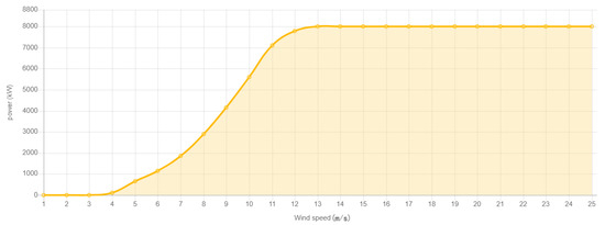 In order to more intuitively describe the output of the wind turbine and observe the change in the annual cumulative energy generation of the wind turbine, it was necessary to calculate the energy generation of the fan at each moment. The turbine selected for this example is Vestes V 164-8.0, and its power curve is shown in Figure 5 below. The specific output power calculation can be calculated according to the following methods: When , the wind speed is less than the starting wind speed of the turbine and the wind turbine does not start, P = 0. When , the output power gradually increases with the increase in wind speed. At this time, the relationship between the output power and wind speed meets the following Figure 5: