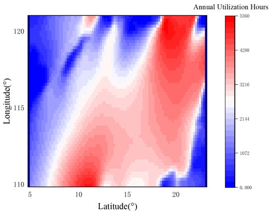 where  is the annual power generation of the region and  is the rated power of the wind turbine. The relationship between annual availability hours and location in different anemometer sub-regions of the South China Sea is shown in Figure 6, and the distribution of availability hours in the entire anemometer sub-region of the South China Sea is shown in Figure 7.