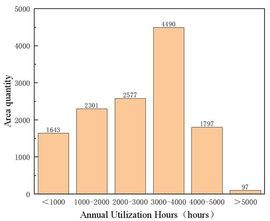 When , the output power remains stable, . When , to protect the turbine, the turbine stops running, P = 0, where  is the cut-in wind speed of the turbine,  is the rated wind speed of the wind turbine,  is the cut-out wind speed of the wind turbine, and  is the rated power of the turbine. The output power of the wind turbine at each time can be obtained using the above algorithm, and the annual cumulative power generation can be obtained by adding all the hours of the year. Through the annual cumulative power generation of the wind turbine, the annual available hours of the wind turbine in different wind speed sub-regions can be obtained: