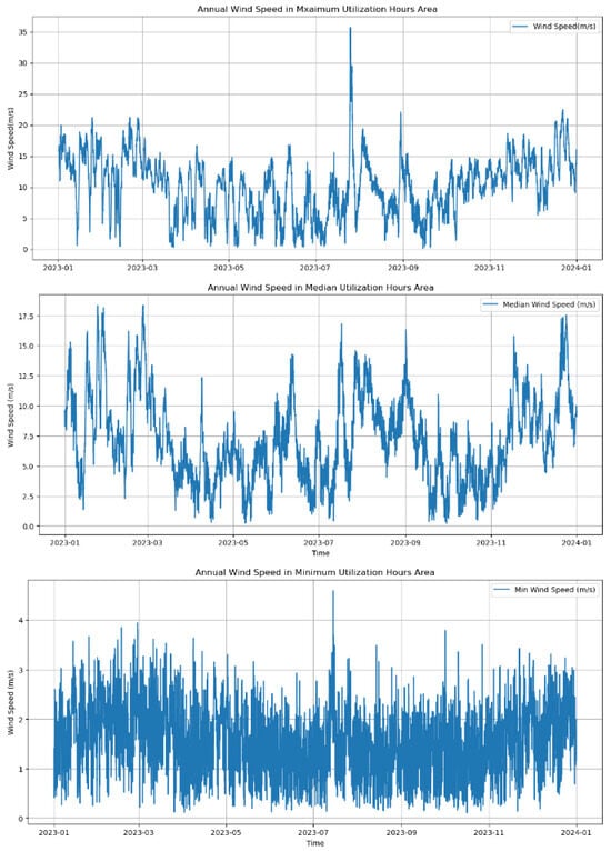 The annual wind speed changes in three different sub-regions are shown in Figure 9. The overall wind speed in the Min region is below 3 m/s, and most of the time, the wind speed is in the unutilized category of wind speed of the wind turbine, so it cannot be effectively used for power generation. Most of the wind speed in the Median region is in the range of 3–12 m/s, which is in the usable wind speed range of the fan. However, in most cases, it is difficult to reach the rated output power of the wind turbine, so its annual available hours cannot reach a higher value. The overall wind speed in the Max region is in the range of 5–15 m/s, and the wind speed can reach the rated wind speed of the fan for a large part of the time, so the capacity coefficient of the wind turbine can be better improved.