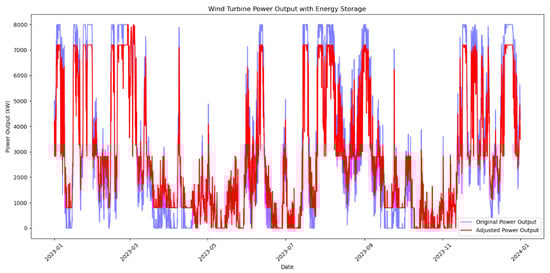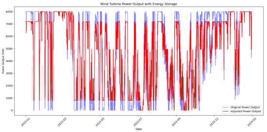The annual available hours of the Min region are far less than 1000 h, so it can be considered that the wind resources in the region cannot be effectively utilized, so the output power of the wind turbine in the region is not considered. The annual output power fluctuation of the Max region is 40.22%, and that of the Median region is 35.58%. According to the requirements of China on wind power in 2024, at least 10% of the energy storage capacity should be configured to smooth the volatility of wind power. Figure 10 shows the power curve after 10% capacity of electrochemical energy storage is configured in the Max area, and Figure 11 shows the power curve after 10% energy storage is configured in the Median area. The purpose of the storage is to make its hourly output power close to its annual average power, so that the output power of the wind turbine is smoother. After energy storage configuration, the output power volatility of the Max region dropped to 34.15%, and that of the Median region to 29.78%. After energy storage configuration, the overall volatility of the two regions decreased significantly.