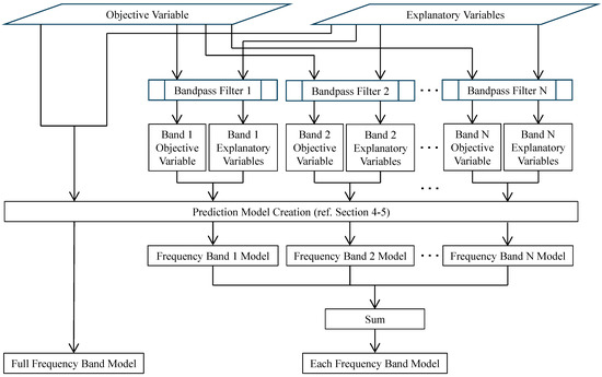 In this study, in addition to the usual method of creating a prediction model for full frequency bands (full frequency band model), we propose a method of dividing the objective and explanatory variables into frequency bands according to the physical phenomena, creating a prediction model for each and, finally, integrating them (each frequency band model). Our aim, here, is to avoid a situation where the prediction of the frequency band with the strongest impact is prioritized and the prediction accuracy for the other frequency bands deteriorates, due to a model being created for all the frequency bands at once. The workflow of the analysis is shown in Figure 2. The frequency band division is applied as described in Section 2.3.