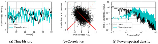 In regard to the nacelle behavior, five variables were investigated in regard to the axial and rotational behavior around the three axes, as shown in Figure 3, excluding the behavior in the Z-axis direction, where the changes were minimal. We also investigated the displacement/angle, velocity/angular velocity, and acceleration/angular acceleration of each of the variables. The velocity/angular velocity and acceleration/angular acceleration are not highly correlated with the nacelle behavior, but some displacements/angles are highly correlated. MYTb and MYTm are highly correlated with the X displacement and nod angle, but MYTt is not. MXTb and MXTm are highly correlated with the Y displacement and roll angle, but MXTt is not. MZTb, MZTm, and MZTt are highly correlated with the yaw angle.