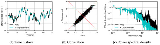 The results of the two aeroelastic analysis cases (average wind speed of 8 m/s and 14 m/s) were standardized by subtracting the mean and dividing by the standard deviation, and the time history and power spectral density of the MYTb and each explanatory variable were compared.